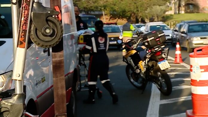 Uma mulher foi atropelada por uma motocicleta e precisou ser socorrida. Equipes de resgate dos bombeiros estiveram no local e encaminharam a vítima ao hospital Mario Gatti.