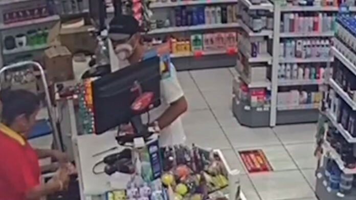 Câmeras de segurança flagraram o momento em que um homem assaltou uma farmácia no bairro Jardim Santana, em Hortolândia. No momento da ação, ele estava usando boné e máscara, o que dificulta a identificação do assaltante.