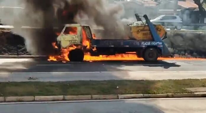 Um caminhão pegou fogo no início da tarde desta segunda-feira, 6, na avenida John Boyd Dunlop, em Campinas. O incêndio aconteceu na via no sentido Campo Grande. Apesar do susto, ninguém se feriu, apenas danos materiais.