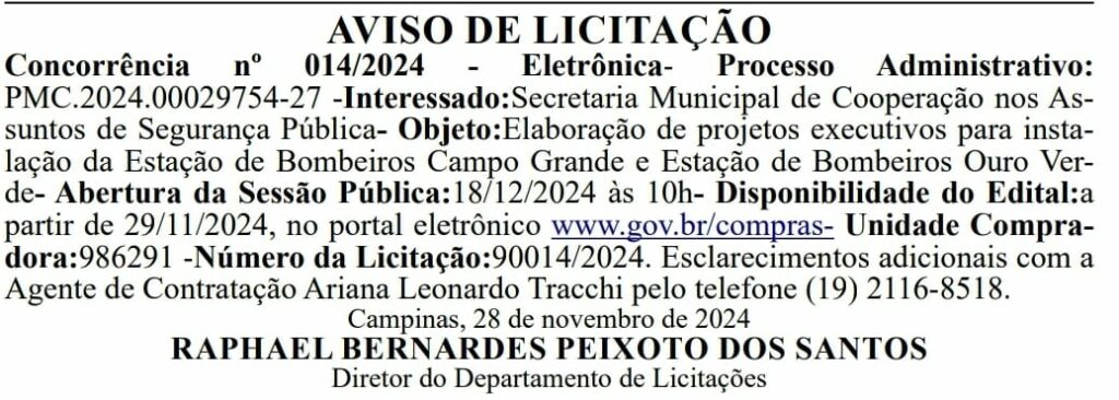 O Aviso de Licitação de Concorrência número 014/2024, publicado na sexta-feira no Diário Oficial do Município de Campinas, prevê a contratação de empresa para a elaboração de projetos executivos para instalação da Estação de Bombeiros Campo Grande e Estação de Bombeiros Ouro Verde.