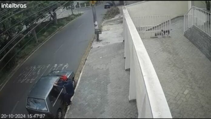 O circuito de segurança do condomínio capturou toda a ação. O homem, ainda não identificado, anda rapidamente pela calçada, observa a movimentação da rua, em seguida se aproxima do veículo, arromba porta e foge do local com o carro da podóloga.