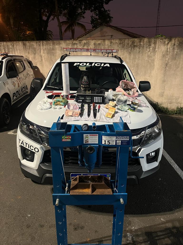 No local, o suspeito foi abordado e com ele estavam duas porções de maconha e 2 mil reais. Após vistoria no estabelecimento, foram encontradas mais porções de maconha, cocaína e crack, além de equipamentos para embalo de drogas, balança de precisão, prensa hidráulica e duas munições de arma de fogo.