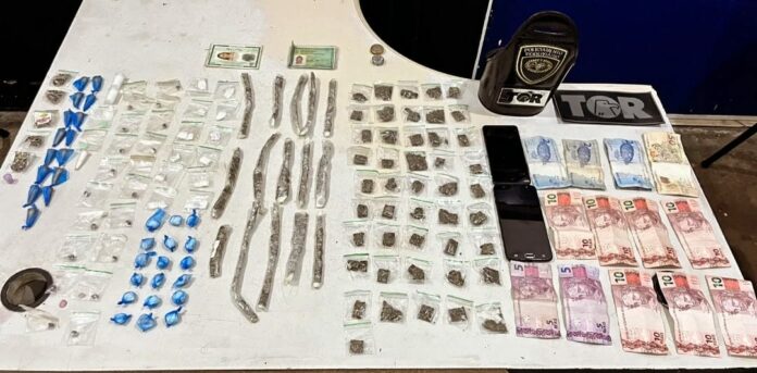 Depois disso, os policiais localizaram em um terreno baldio próximo grande quantidade de drogas escondidas. Entre as substâncias apreendidas estavam 35 envelopes de haxixe, 50 de maconha e 50 pinos de cocaína, totalizando aproximadamente 0,242 kg de entorpecentes.