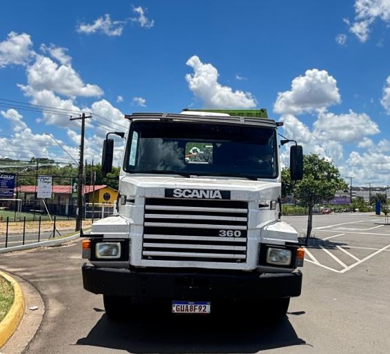 O caminhão era um Scania 112, branco, com para-choque preto e carreta vermelha.