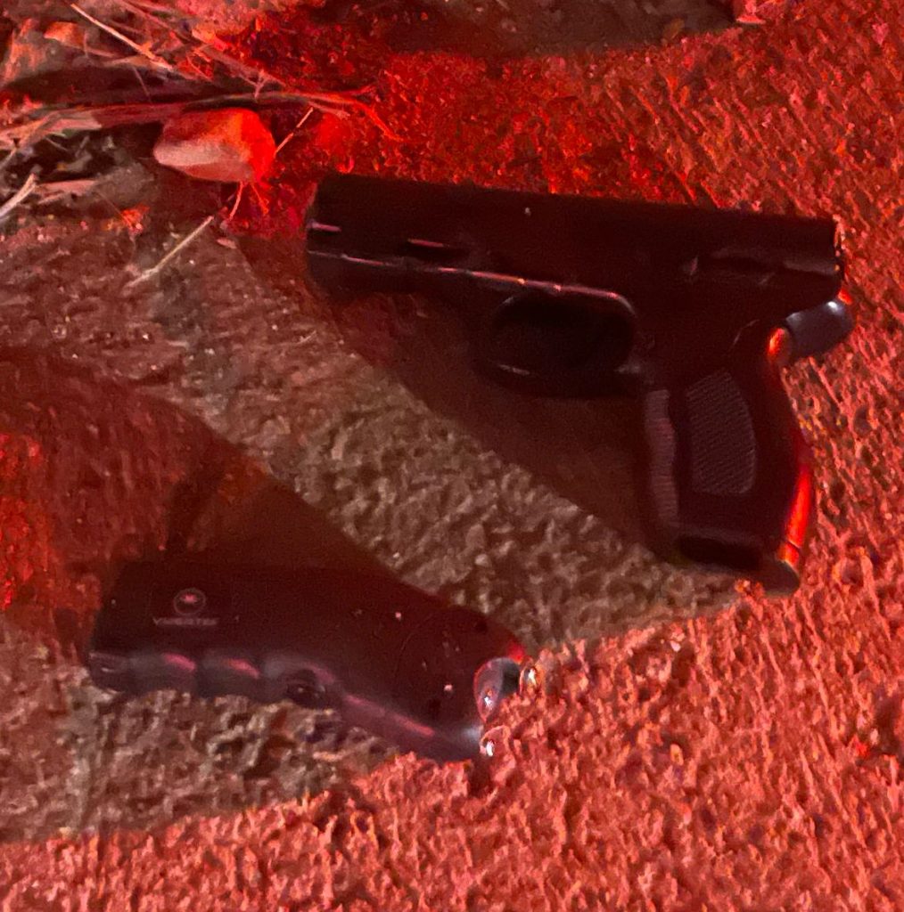 Após a abordagem, os pms constataram que a arma, se tratava de uma réplica de pistola. Indagado, o outro rapaz disse que ambos estavam indo até uma biqueira para buscar entorpecentes, e planejavam assaltar o traficante. A arma do pm foi apreendida para perícia. E o caso registrado no Plantão Policial.