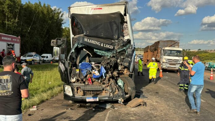 Um engavetamento envolvendo três caminhões e uma caminhonete interditou parcialmente a Rodovia Washington Luís (SP-310) na tarde desta quinta-feira (15), na altura do km 161,700, sentido norte. Um dos motoristas ficou ferido e precisou ser levado de helicóptero à Unicamp, em Campinas.