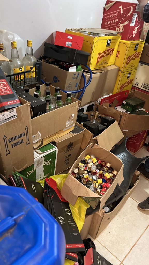 Durante conversa com os policiais, eles indicaram o local onde as bebidas falsas eram produzidas. Lá, os policiais encontraram uma grande quantidade de garrafas de marcas famosas prontas para a venda, diversos lacres de segurança, um tijolo de maconha e outros objetos usados na venda de drogas.