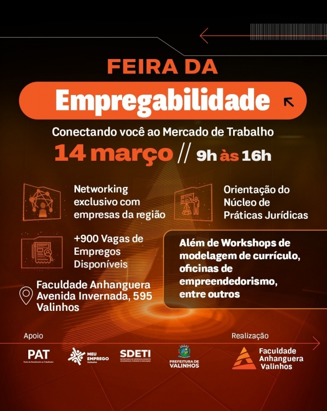 Valinhos se prepara para receber nesta quinta, 14, centenas de candidatos de Valinhos, Vinhedo e Campinas às quase mil vagas de empregos que serão ofertados na Feira da Empregabilidade. O evento acontece das 9h às 16h, e será aberto à população. É uma parceria entre a Prefeitura e a FAV, com o apoio do Posto de Atendimento ao Trabalhador (PAT).