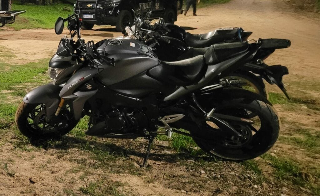 O grupo foi abordado e na área, foram localizadas cinco motos. A Suzuki GSX, duas XRE 300 de cor cinza, e duas GCs. Todas com sinais identificadores adulterados. Três dos suspeitos foram presos, e dois menores apreendidos. O caso foi apresentado no Plantão Policial.