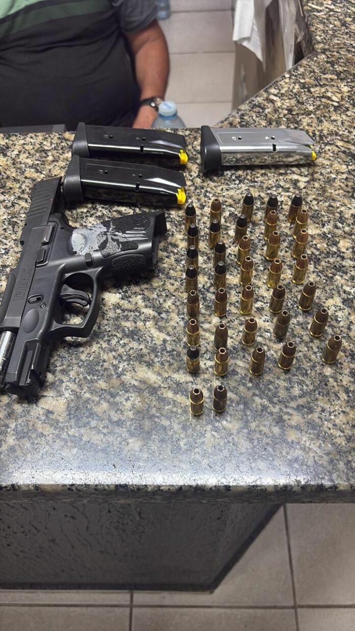 Com base nas características repassadas, os policiais iniciaram buscas e localizaram o homem junto ao veículo utilizado em um posto de combustíveis da cidade. Durante a abordagem, nada de ilícito foi encontrado com o suspeito. No entanto, ao realizarem a vistoria no veículo, os policiais localizaram uma pistola calibre 9mm municiada, além de três carregadores e 37 munições intactas.
