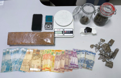A Polícia Militar então se dirigiu ao endereço informado, onde encontrou diversos entorpecentes e materiais ligados ao tráfico. O total apreendido incluiu dinheiro, drogas, balanças de precisão e um celular. O veículo usado na ação também foi apreendido.