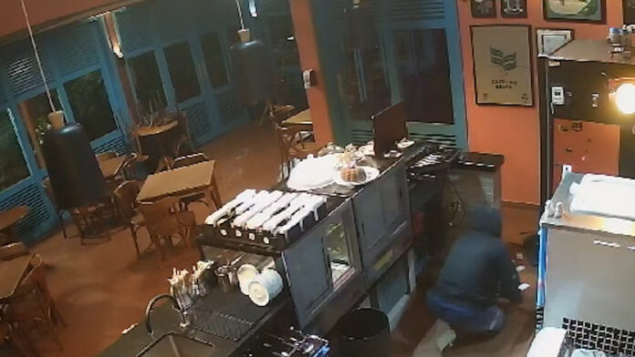 Um homem foi flagrado por câmeras de segurança, invadindo uma cafeteria e fugindo com uma televisão em Araras. Após o alarme disparar, o proprietário recebeu um aviso pelo celular e viu pelas imagens, uma pessoa se arrastando dentro do estabelecimento.