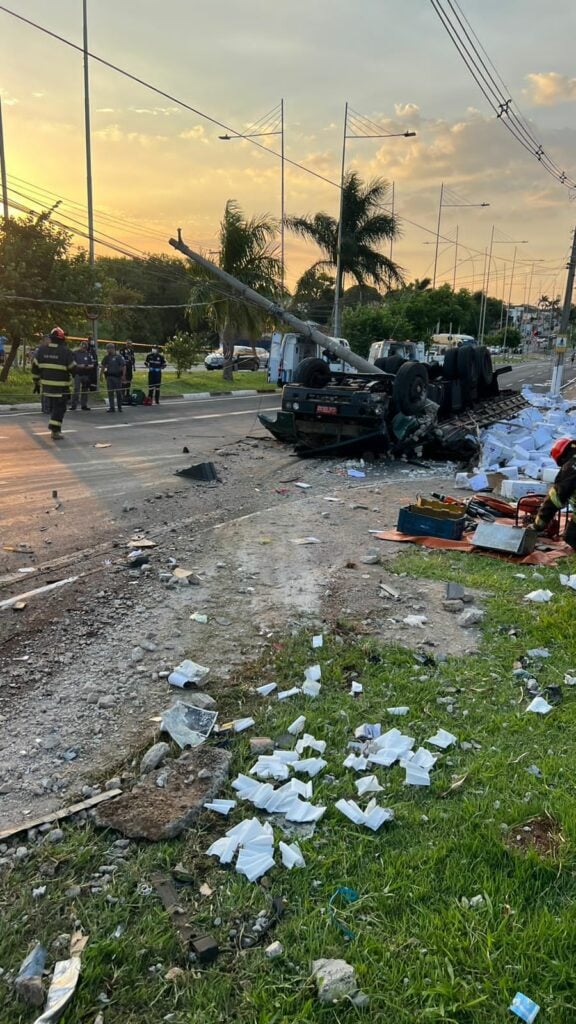 As informações iniciais são de que o caminhão teria perdido o freio na descida da avenida, colidiu com um carro e depois com o poste. O acidente foi na altura do Paço Municipal.