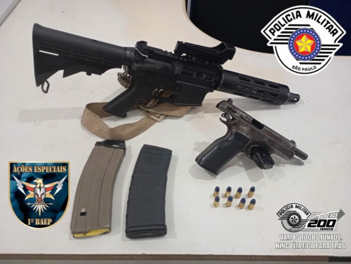 Em entrevista feita pela polícia, o suspeito confirmou ter armas de fogo na garagem de um condomínio residencial. A equipe da PM foi até o lugar indicado e encontrou um fuzil, uma pistola calibre 9 milímetros e 8 munições.