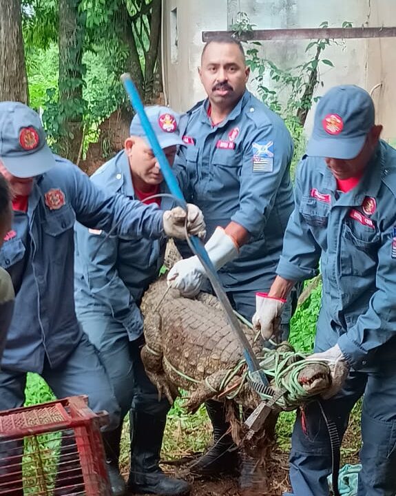 A Defesa Civil foi acionada para ir até o local. Os agentes conseguiram amarram a boca do animal e retirá-lo do sítio em segurança. Após remover o réptil, eles colocaram o jacaré dentro da viatura e levaram até uma área chamada ”Espaço Natureza”, onde habitam outros animais da mesma espécie.