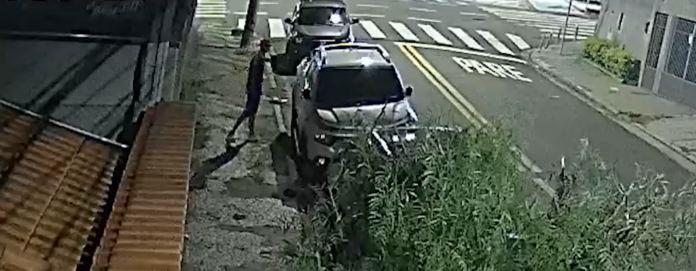 As imagens mostram um carro parando atrás de uma fileira de veículos estacionados na Rua Ana Jacinta de Andrade Couto. Um homem desce do banco do passageiro, indicando que havia um comparsa na direção. Com uma lanterna, ele começa a averiguar o interior dos veículos para ver o que tem dentro.
