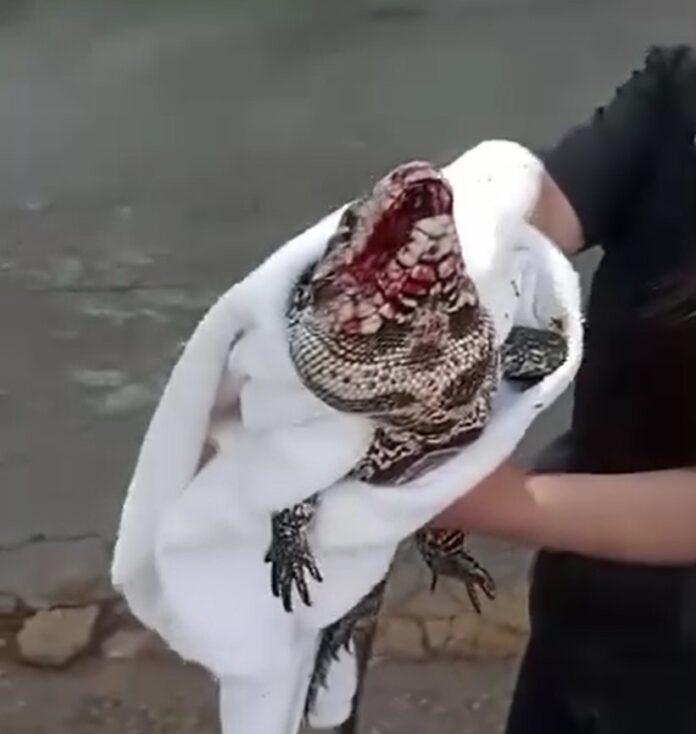 O réptil ficou levemente ferido e, após o incidente, foi rapidamente encaminhado a uma clínica veterinária, onde está recebendo os cuidados necessários para se recuperar.