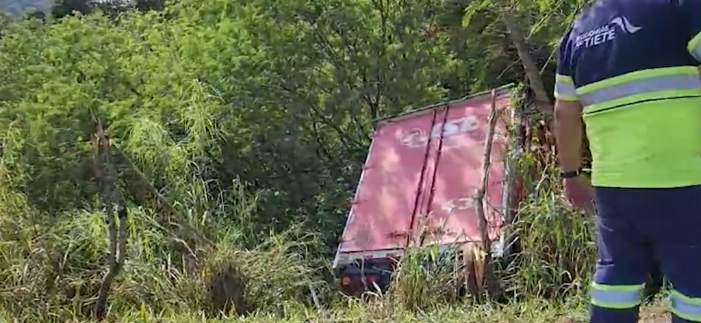 O veículo transportava uma carga de caixas plásticas. O barranco, vegetação e um córrego que passa pelo local, dificultaram o trabalho de socorro e retirada do caminhão.