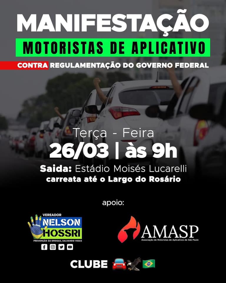 Em Campinas, a categoria organiza uma manifestação com motoristas de aplicativo, a partir das 9h. Com saída do Estádio Moisés Lucarelli, com carreata até o Largo do Rosário.