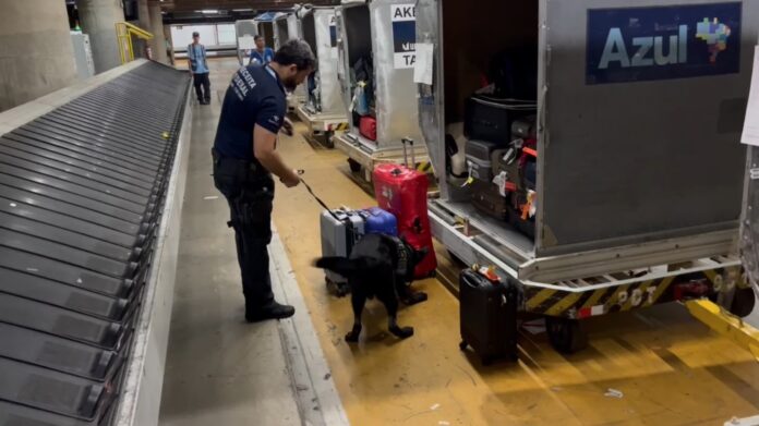 A descoberta da droga foi durante fiscalização de bagagens. Cães treinados para farejar drogas foram usados durante a fiscalização.