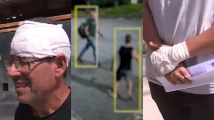 Câmeras de segurança flagraram o homem sendo surpreendido por um agressor na porta de casa. Ao tentar defender o pai, o filho acabou sendo golpeado e ferido pelo agressor. O Pai, Vilson, precisou levar 13 pontos na cabeça. O filho, Endrew, teve um corte profundo no pulso.