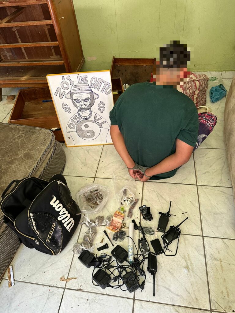 A Polícia Civil realizou uma operação com o apoio da Ronda Municipal (ROMU) no interior da Comunidade Pantanal. Eles fizeram um cerco nas possíveis rotas de fuga do ponto de tráfico. Um rapaz de 18 anos que estava no local tentou fugir a pé, mas acabou sendo detido.