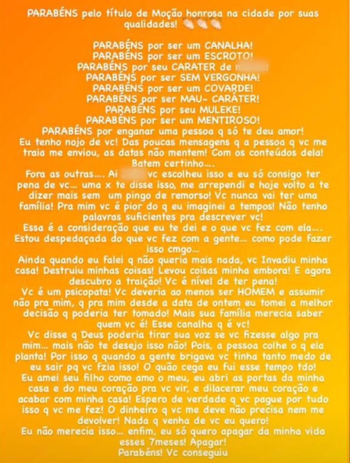 No print de uma publicações feita exclusivamente para os “melhores amigos” de uma rede social, a vítima faz ofensas ao então namorado e expõe que estava sendo traída por ele. Após dizer que conversou com uma das amantes do homem, ela ainda relata que o suspeito teria invadido a casa dela e quebrado objetos, após ela dizer que não queria seguir com o namoro.
