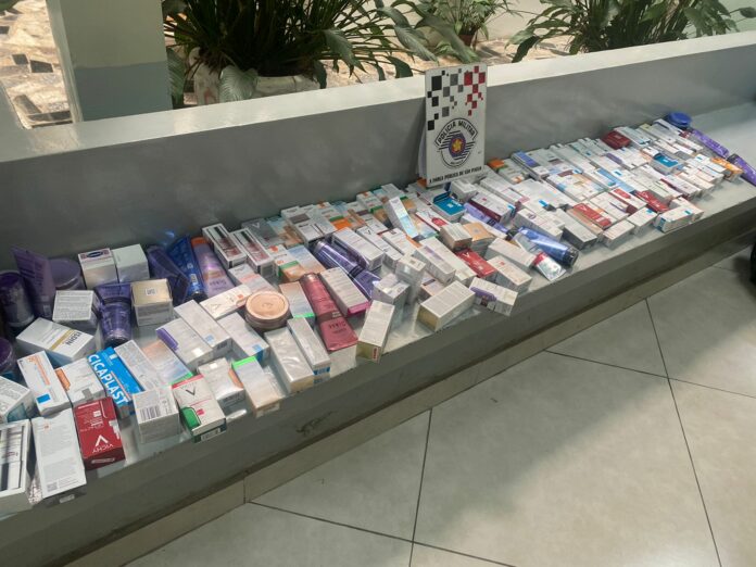 Com apoio de outras viaturas, um quarto integrante do grupo foi localizado dentro de um Renault Sandero estacionado nas proximidades. No interior do veículo, foram encontrados diversos medicamentos e produtos cosméticos levados do estabelecimento. A placa do carro estava adulterada e, após consulta, foi confirmada como pertencente a um veículo roubado.
