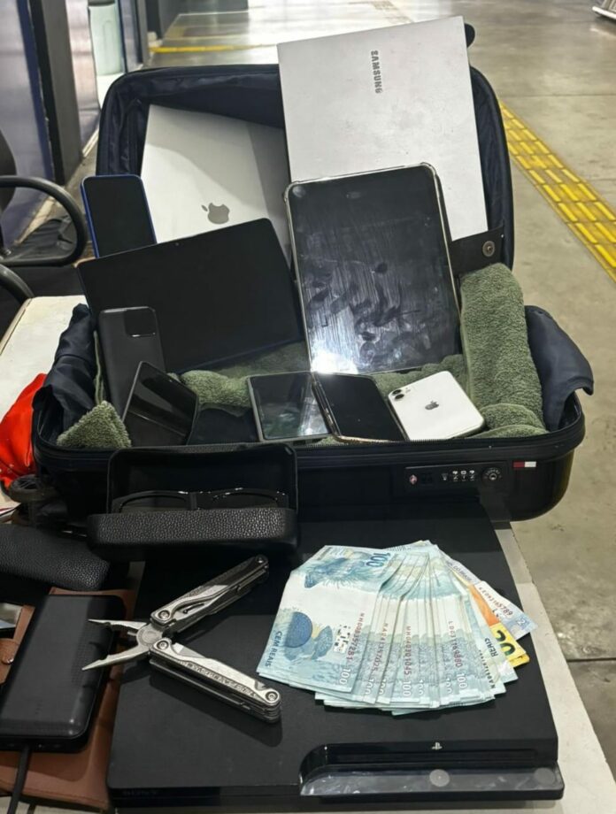 Nas bagagens, os policiais localizaram diversos eletrônicos, óculos de marca, um videogame PlayStation e mais de R$ 3 mil em dinheiro.