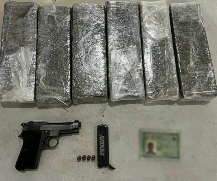 Durante abordagem, os policiais identificaram o criminoso como sendo membro da organização criminosa PCC, conhecido por “Magrelo”, tentando fugir do local. Em busca pessoal, foi localizada uma Pistola Beretta .765. Posteriormente em diligências pelo local também foram localizados 6 (seis) tijolos de maconha.