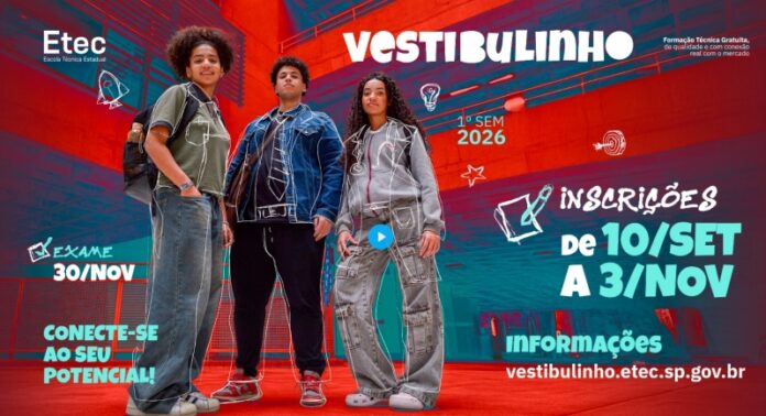 As inscrições para o vestibulinho que selecionará os alunos para as primeiras turmas já estão abertas e seguem até o dia 3 de novembro, exclusivamente pelo site vestibulinho.etec.sp.gov.br.