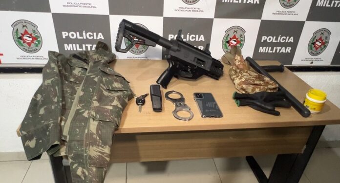 A equipe acompanhou o veículo e realizou a abordagem em um ponto mais afastado, por causa da grande circulação de moradores na comunidade. Durante a revista, os policiais encontraram uma submetralhadora calibre 9 milímetros de fabricação caseira, além de uma algema.