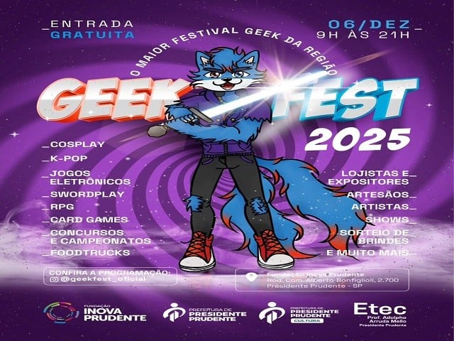 O Geek Fest Prudente 2025 já tem data marcada: 06 de dezembro de 2025, das 9h às 21h, na Fundação Inova Prudente, iniciativa da Prefeitura Municipal, Sebrae e Etec Professor Adolpho Arruda Mello.