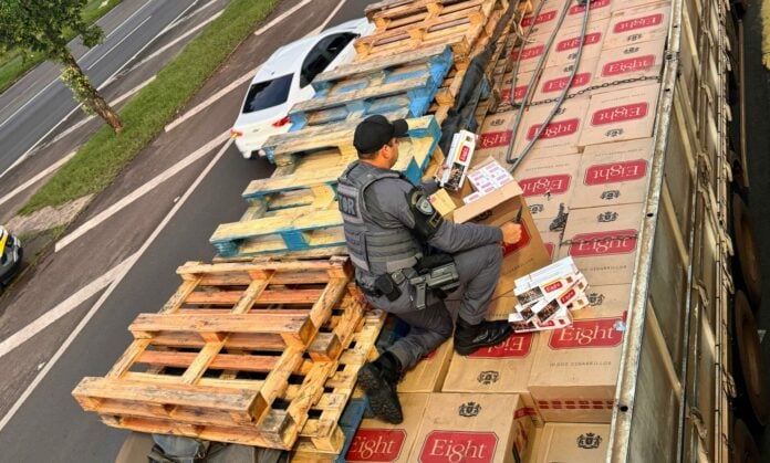 Ao inspecionarem o compartimento de carga, os policiais encontraram o grande carregamento de cigarros da marca “Eight”, de origem estrangeira.