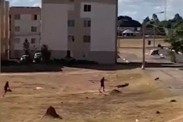 Vídeo divulgado nas redes sociais flagrou a ação. O adolescente aparece correndo atrás do pai. Em determinado momento, quem está gravando diz que a arma teria “falhado”. O homem cai no chão após o barulho de um disparo e outras pessoas gritam diante da cena.
