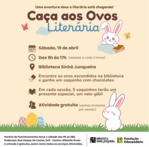 Na Biblioteca Sinhá Junqueira acontece a Caça aos Ovos Literária, uma atividade lúdica e educativa que celebra a Páscoa e incentiva o hábito da leitura entre as crianças. As primeiras 5 pessoas que encontrarem um saquinho, além do doce, irão ganhar um livro ou gibi.