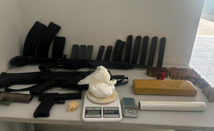 No imóvel, foram apreendidos duas pistolas, um fuzil, uma metralhadora e munições. Os agentes também encontraram porções de drogas. O caso está em andamento.