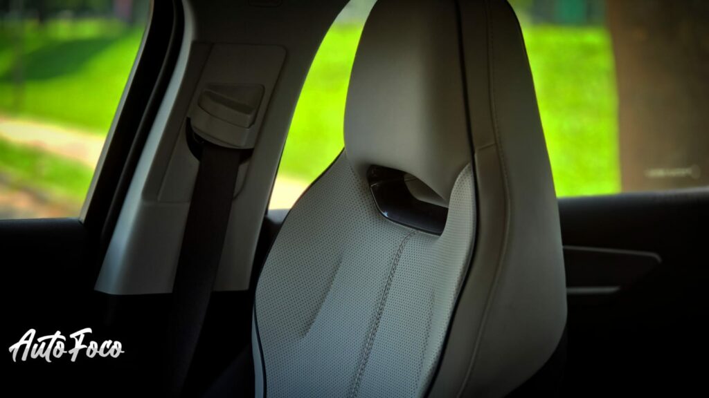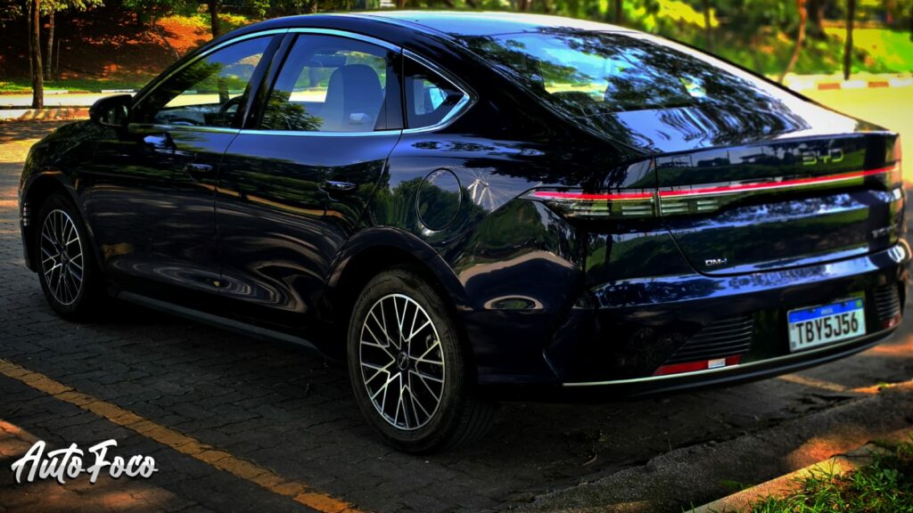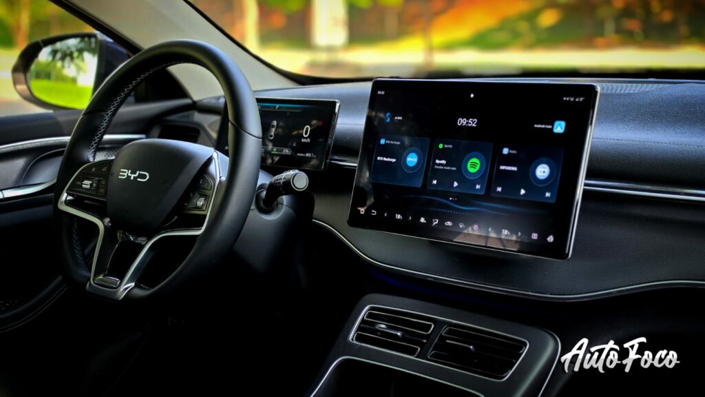 O espaço interno acompanha as dimensões externas, oferecendo bom conforto para passageiros, especialmente no banco traseiro. Já o interior traz um pacote tecnológico relevante, com destaque para a central multimídia de 12,8 polegadas com rotação, painel digital e acabamento com materiais macios ao toque.