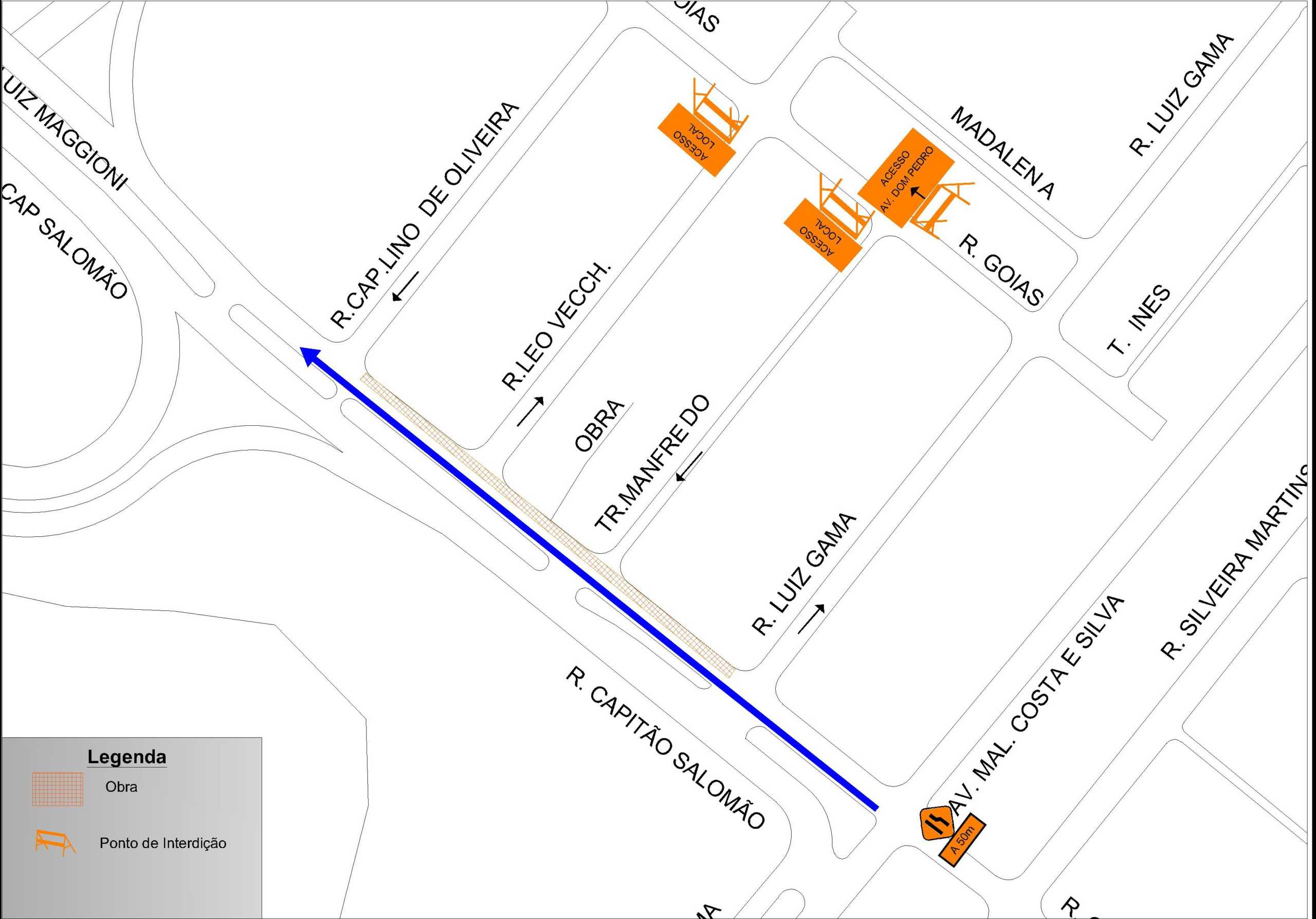 A interdição na avenida, especificamente, acontece em uma das faixas de rolagem entre as ruas Luiz Gama e Capitão Lino de Oliveira.