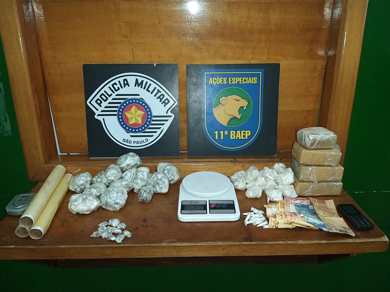 Ao todo, a equipe apreendeu quatro tijolos de maconha, 338 unidades de maconha pronta para a venda, 207 microtubos de cocaína, duas balanças de precisão, plástico filme para embalar o entorpecente, duas balanças de precisão e R$ 152 em dinheiro trocado.