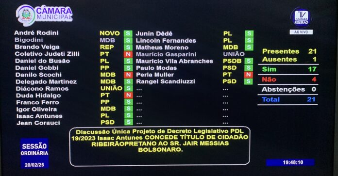 A Câmara de Ribeirão Preto aprovou nesta quinta-feira (20), por 17 votos, a concessão do título de cidadão ribeirãopretano ao ex-presidente do Brasil, Jair Bolsonaro (PL).