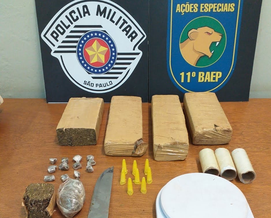 No local onde o averiguado foi visto, a equipe do BAEP apreendeu um tijolo de maconha já cortado, uma faca, três rolos papel filme e uma balança de precisão.