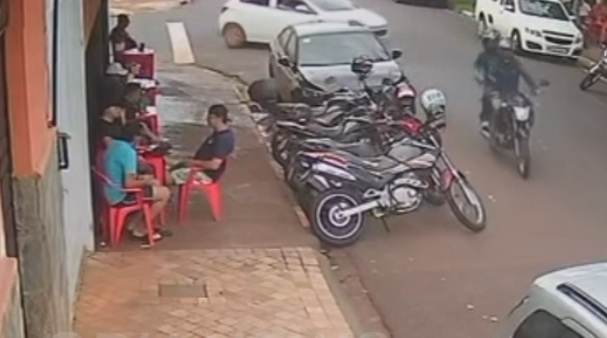 Neste momento, o garupa desce e avança contra os clientes sentados no lado externo do estabelecimento, enquanto o condutor aguarda o término do crime na própria motocicleta, que estava com a placa tampada por fitas.
