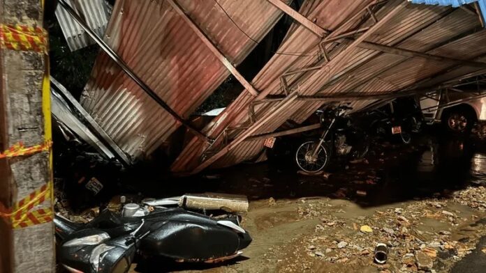 Uma chuva forte, acompanhada de rajadas de vento, provocou a queda de uma estrutura metálica sobre 20 carros que estavam estacionados em um supermercado em Presidente Venceslau, no interior de São Paulo, na noite desta quinta-feira (7).