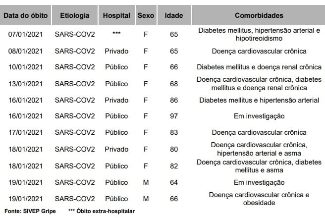 Os dados divulgados nesta quinta mostram, ainda, 11 novos mortos. São nove mulheres e dois homens, sendo que o paciente mais novo tinha 64 anos e o mais velho, 97.