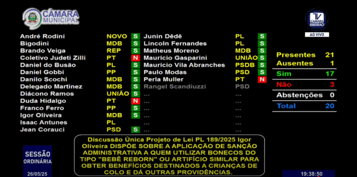 Por 17 votos, os vereadores de Ribeirão Preto decidiram nesta segunda-feira (26), durante a 32ª Sessão Ordinária, a aprovação do Projeto de Lei que pune quem utilizar o bebê reborn para benefícios próprios e outras facilidades previstas em lei para mães de crianças de colo.