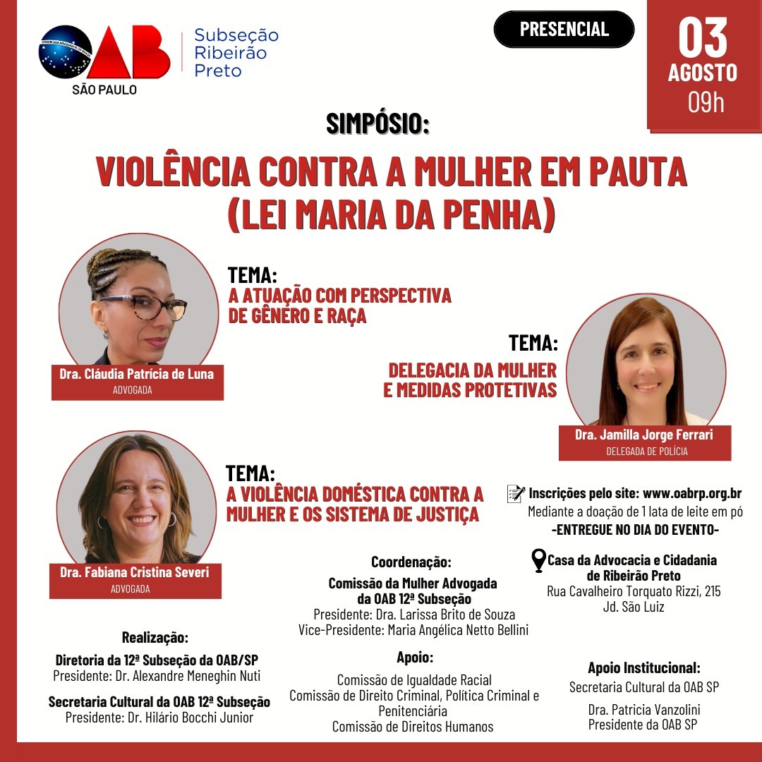 A Comissão da Mulher Advogada da 12ª Subseção da Ordem dos Advogados do Brasil-OAB-, de Ribeirão Preto-, realiza no próximo dia 3, quinta-feira, às 9 horas, o Simpósio “Violência Contra a Mulher em Pauta (Lei Maria da Penha)”.