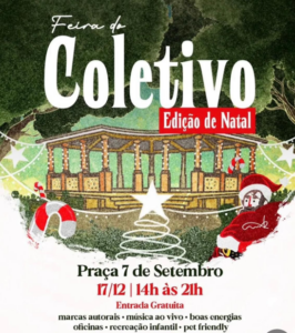 Também para agitar a praça 7 de Setembro, vai acontecer a “Feira do Coletivo edição de Natal”. A feira conta com cervejas artesanais, muita música, foodtrucks, oficinas, brincadeiras para a criançada e visita do Papai Noel.