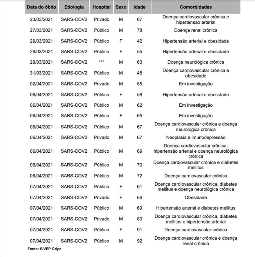As mortes notificadas nesta ocorreram entre os dias 23 de março e 7 de abril. São 14 homens e sete mulheres, sendo o mais jovem um homem de 48 anos e o mais idoso, um de 92. Apenas pacientes não tiveram comorbidades confirmadas, segundo os dados.