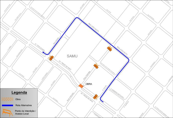 Com o andamento das obras do corredor de ônibus Castelo Branco, nesta sexta-feira, dia 26 de abril foi necessário a interdição total, em caráter emergencial, do cruzamento da pista Centro/Bairro da avenida Treze de Maio com a rua Itapura, no Jardim Paulista, na região Leste.